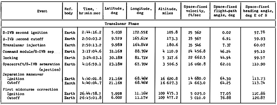 Table 5 click to enlarge. Trajectory parameters from Ignition (in LEO) for TLI through to mid course correction. Note that NASA is using nautical miles in this table. The conversion is nm x1.15078 = one statute mile.