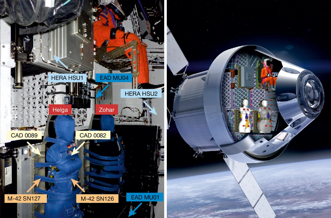 Fig 2. Left: Prelaunch image showing the location of the two female Phantoms Helga and Zohar and radiation instruments aboard Artemis I. The full body male manikin Captain Moonikin is in the commander’s seat. Right: Cutaway diagram illustrating their placement within the spacecraft. S.P. George et al. 2024. Click to enlarge