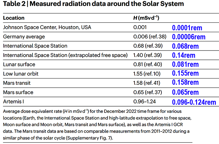Fig 6. Table 2 Note: The source of the low-lunar orbit data is from NASA; the lunar surface data is from China’s National Space Agency (CNSA). S.P. George et al. 2024. See also annotated version with radiation unit conversions.