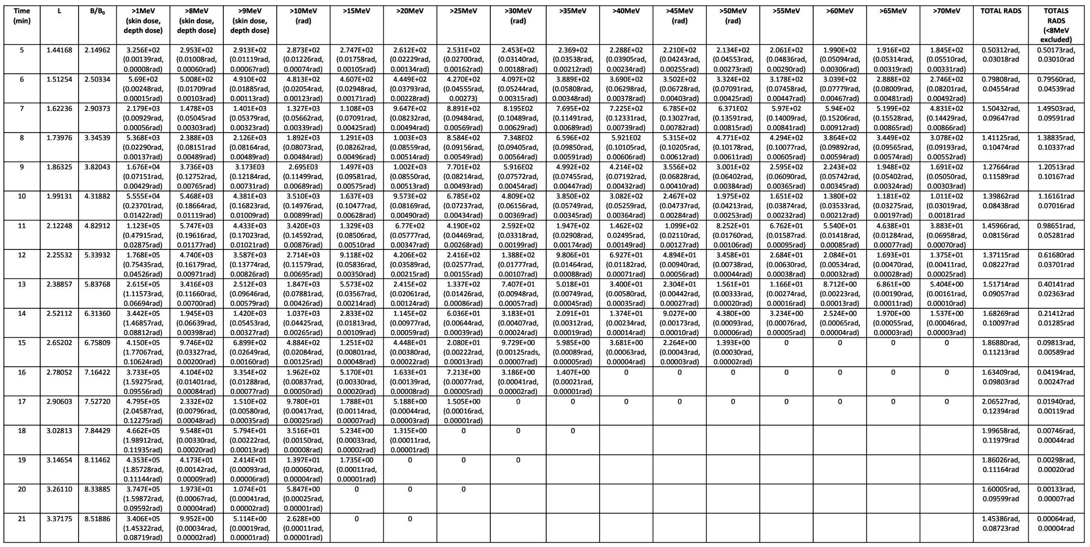 Since NASA only reported the Apollo astronauts’ skin doses, we focus on the M-42 readouts SN-126 (front skin) and SN-127 (rear skin). The total skin dose for Helga’s exposure to the inner and outer Van Allen belts is 2.94mGy (0.294rad).