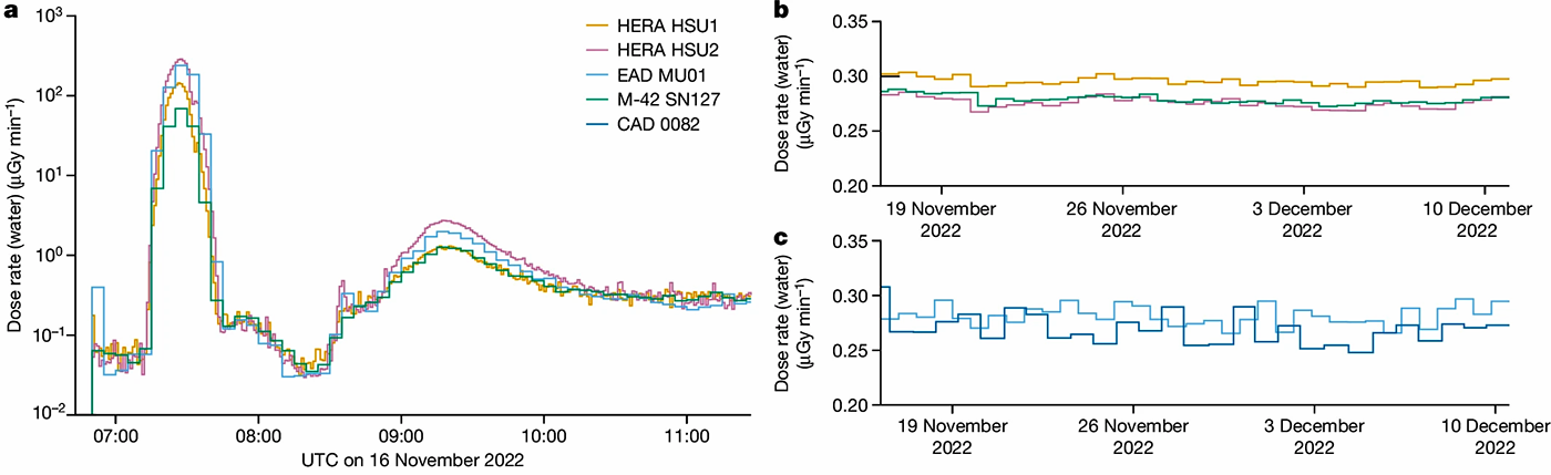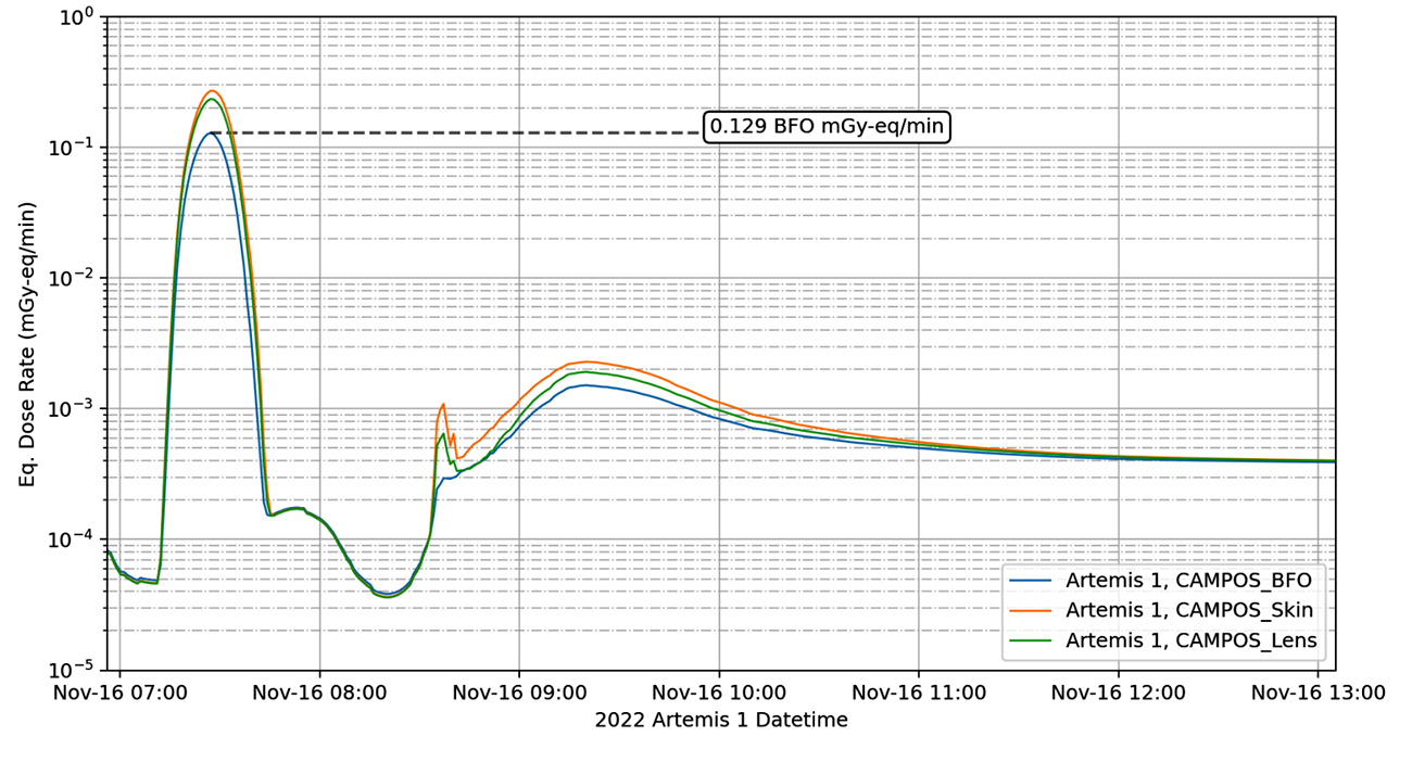 Writing about Artemis I’s passage through the inner proton belt, S.P. George et al. report that the lowest absorbed dose rate was detected by M-42 SN127. This particular detector was positioned on Helga’s back and measured the dose received by her rear skin. It was reported to be 69µGy/min (0.0069rad/min). Meanwhile, the Van Allen proton dose rates measured by the two detectors, EAD MU01 and HERA HSU2, peaked at 287µGy/min (0.0287rad/min) and 240 µGy/min (0.0240rad/min) respectively. The peak dose rates for the electron belt are unspecified in the text, but the graph suggests a dose rate peaking at ~4µGy/min (0.0004rad/min), as measured by HERA HSU2.