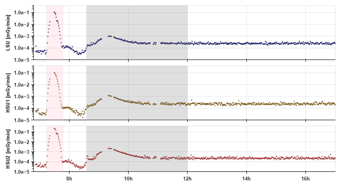 From these data we can see that, despite being locked away behind the bulkhead of the cargo bay intended to double as a makeshift solar storm shelter, HERA HSU1 received the highest dose rate throughout the mission. Its curve fluctuates along the 0.3µGy/min (0.00003rad/min) interval. The GCR readouts from HERA HSU2 and M-42 SN127 seem to cluster around 0.27µGy/min (0.000027rad/min).