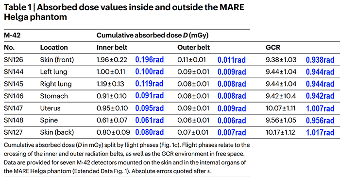 For a more precise analysis, S.P. George et al. provide a table of the accumulated doses as recorded on Artemis I by Helga in mGy. Again, for the reader’s convenience, I have annotated it with mGy to rad conversions. This table specifically focuses on the M-42 detectors intended to measure the radiation doses in Helga’s skin, lungs, stomach, spine and uterus.