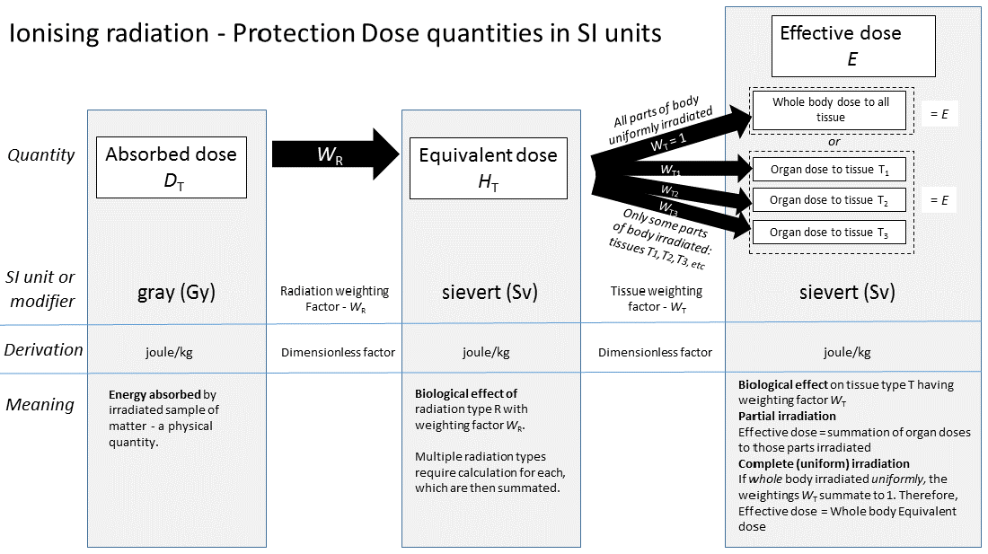 Fig 16. This diagram illustrates the difference between absorbed radiation doses, equivalent radiation doses, and effective radiation doses. click to enlarge